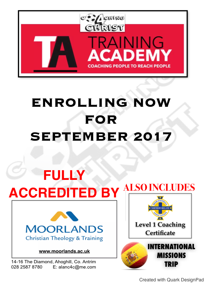 Coaching4Christ Training Academy is enrolling now for September 2017. Are you aged 17+ and interested in soccer and theology? If so, why not get in touch with Coaching4Christ to find out more.