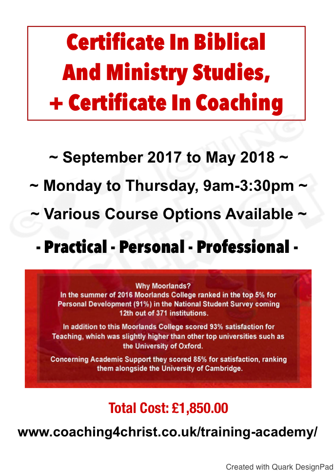 The Training Academy commenced in 2013. It has proven to be very successful with 75% of its graduates going into full time Christian work both with Coaching4Christ and other ministries. This has been further enhanced, having received official Accreditation from highly respected and much proven Moorlands College in England for its Theological and Ministry Course.