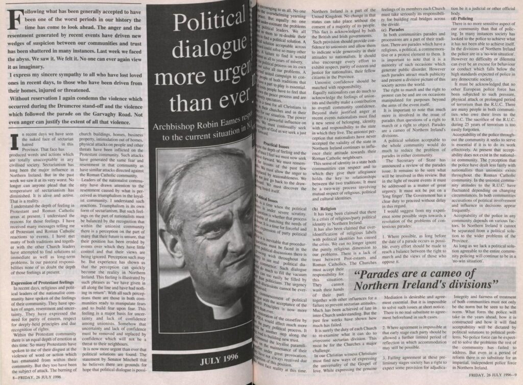 As the crisis deepened in 1996, “letters from North and South and the comments by regular contributors make it clear that this issue had become one of major tension within the Church. So much so that the Archbishop of Armagh [Archbishop Robin Eames] wrote a long, detailed article for the edition of 26th July of that year … [attempting] to address some misconceptions which were widespread at the time, particularly the impression that nothing had been done since the debacle in 1995 to address the problem. On the contrary, Eames explained, he and others had been active throughout the intervening period trying to mediate and moderate. In the same issue, [the columnist] Cromlyn cautions against a hasty rush to judgement until the full picture became clearer.”