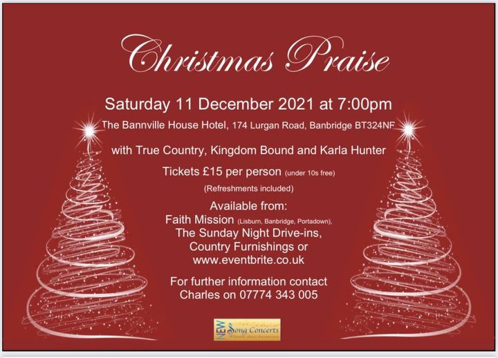 The first one is a Christmas Praise Drive-In taking place at Ballymena Livestock Yard, Woodside Road, Ballymena on Friday 10 December 2021 at 7:30pm. Guest singers are Second Chance, Judith Beattie and Nigel Davidson. Tickets are £15 per person including a voucher for a free burger or chip from the on-site food village. Tickets available from the Sunday Night Gospel Drive In, the Faith Mission outlets in Ballymena, Banbridge, Lisburn and Portadown, Country Furnishings Ballymena or online from this link