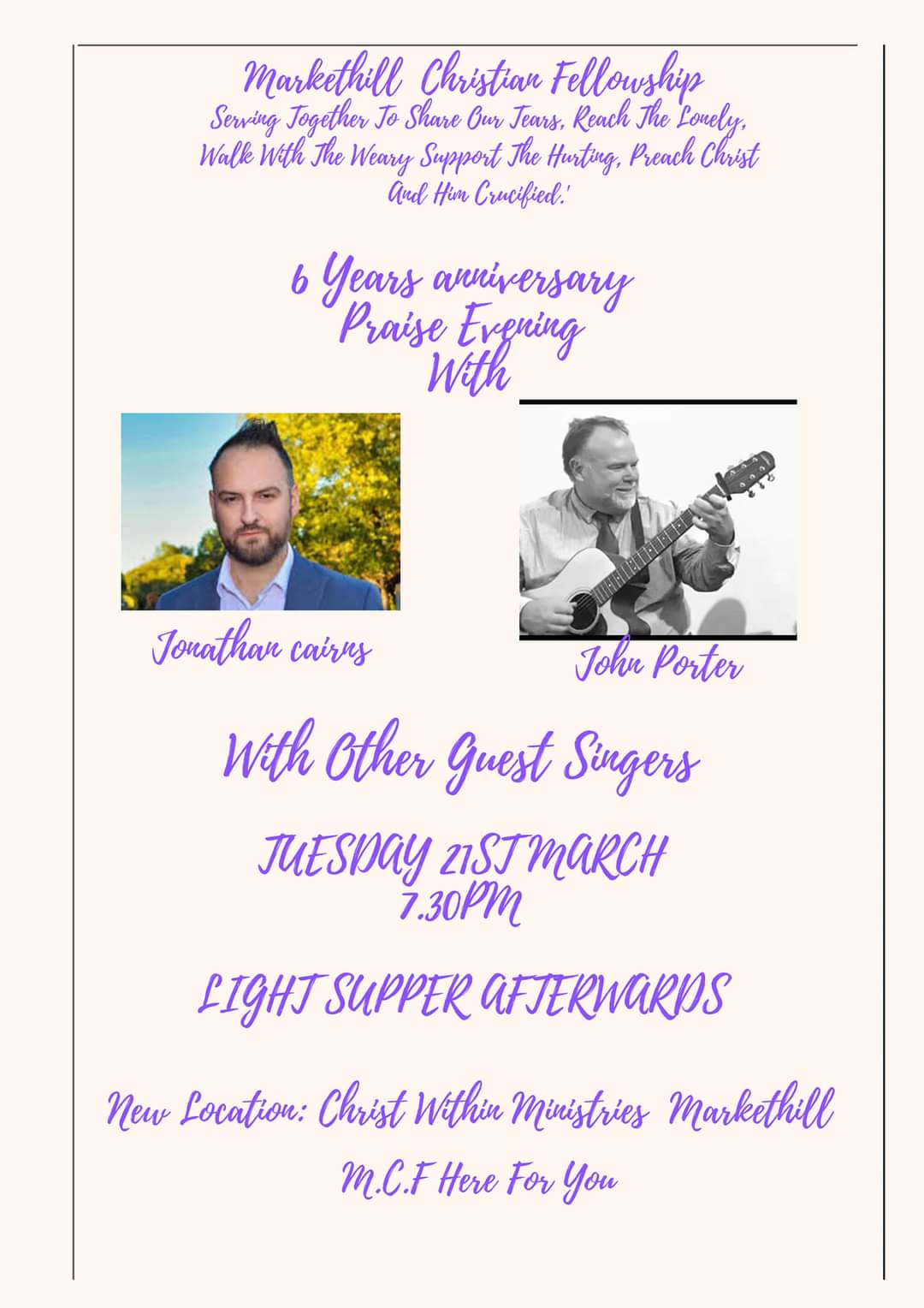 - Tuesday 21st March 2023 – Prayer and Praise Night with Jonathan Cairns and John Porter.
