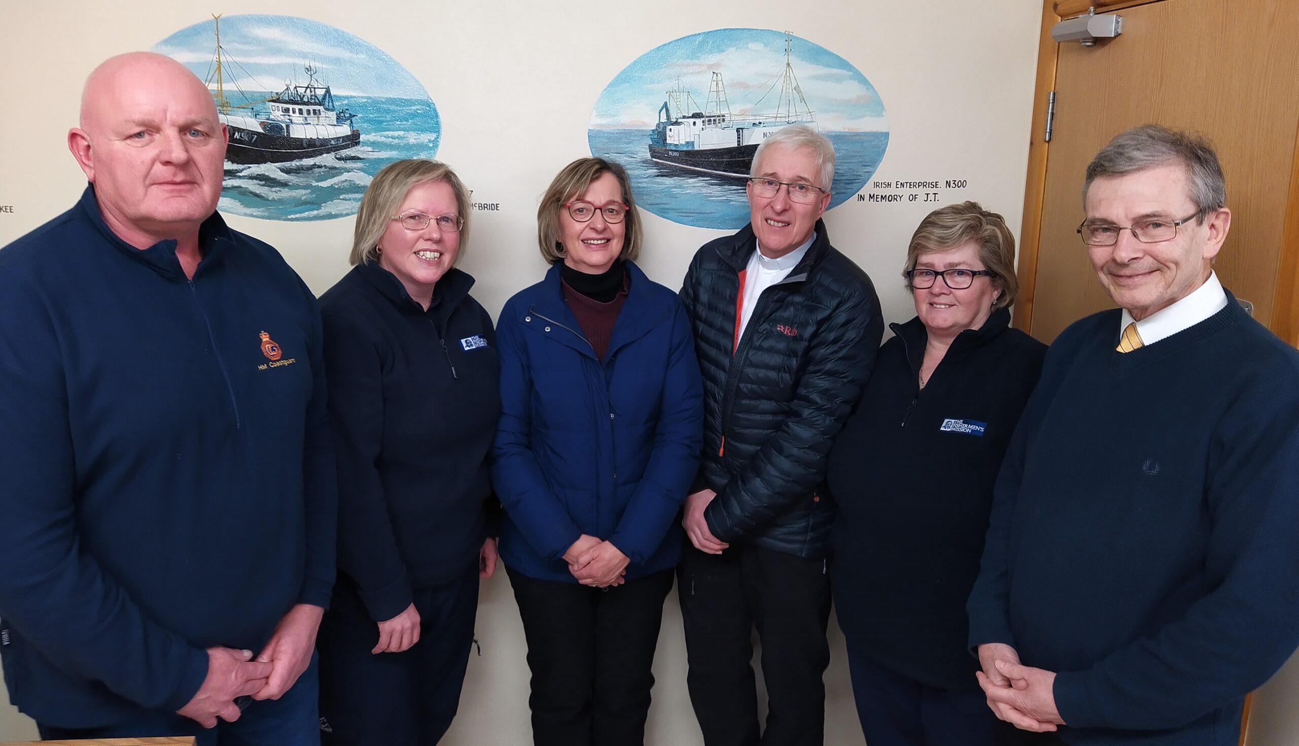 The Presbytery also includes a number of harbours down the east coast, including Kilkeel where fish have been caught, landed and sold since the 1850s. On a wet, windy and snowy day, Dr Kirkpatrick and his wife Joan, paid a visit to the only national charity that supports both active and retired fishermen and their families – the Fishermen’s Mission. Accompanied by the newly elected Moderator of Presbytery, Rev Stuart Finlay and recently appointed Clerk of Presbytery, Rev David McCullagh of Annalong Presbyterian, along with Rev Stephen Johnston, minister of Kilkeel Presbyterian Church, together they met Mission personnel and volunteers at the quayside Mission, including the Senior Coastal Operation Manager for His Majesty’s Coast Guard.